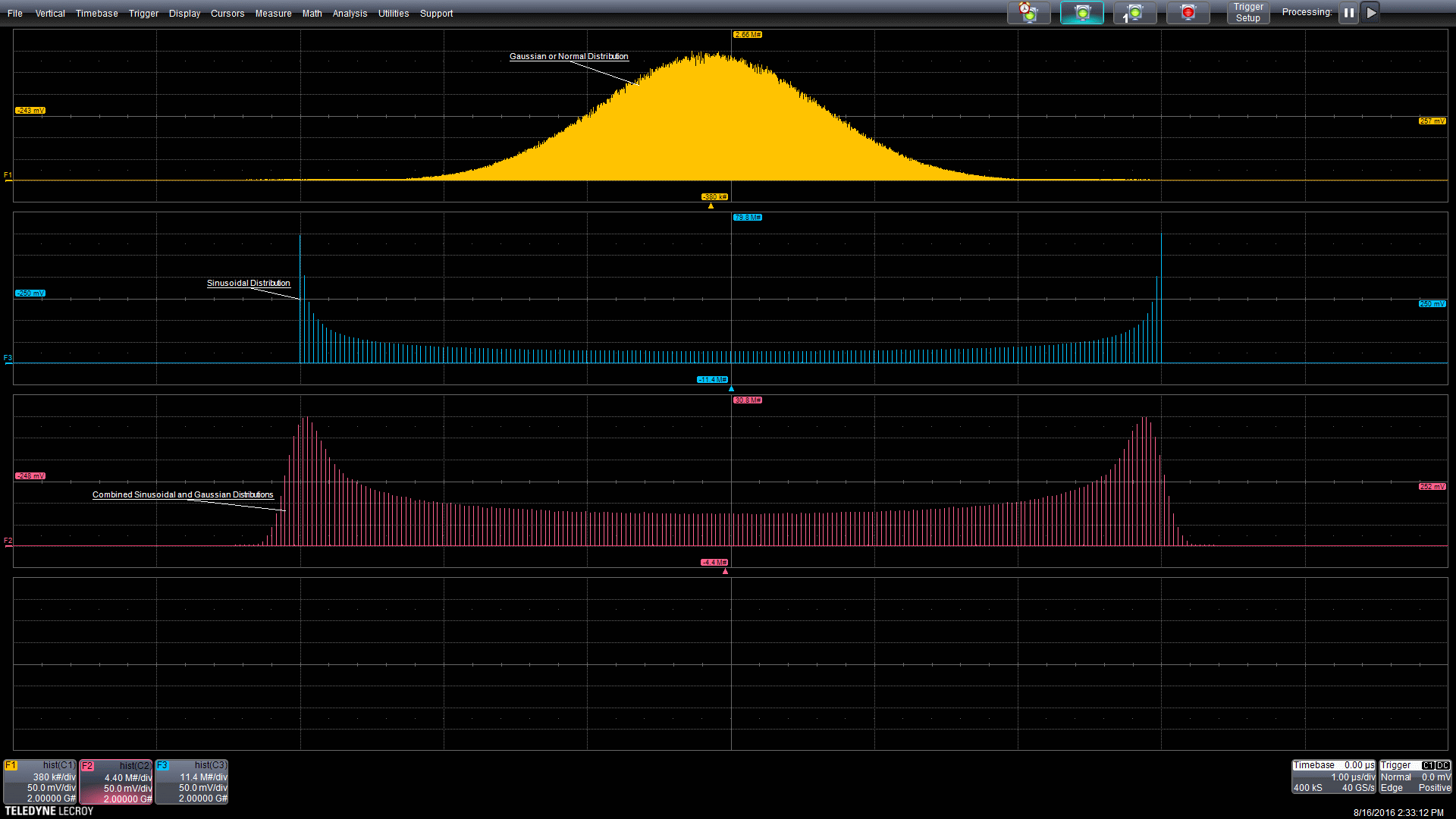 In the example graphic below, two random processes interact. When that happens, the probability densities of the processes are mathematically convolved. A common example in electronics is timing jitter where random and deterministic jitter component combine. The graphic below shows a Gaussian and a sinusoidal component being combined. The source distributions are in the top two grids. The resultant distribution, third grid from the top, is the convolution of the two sources.